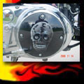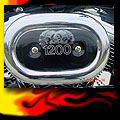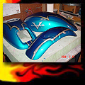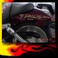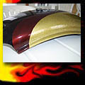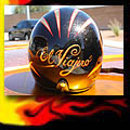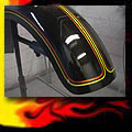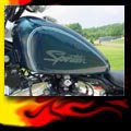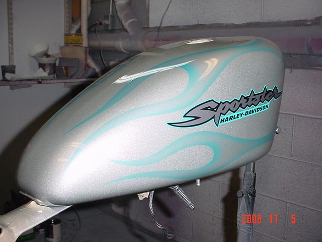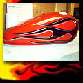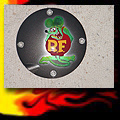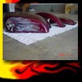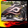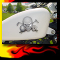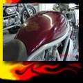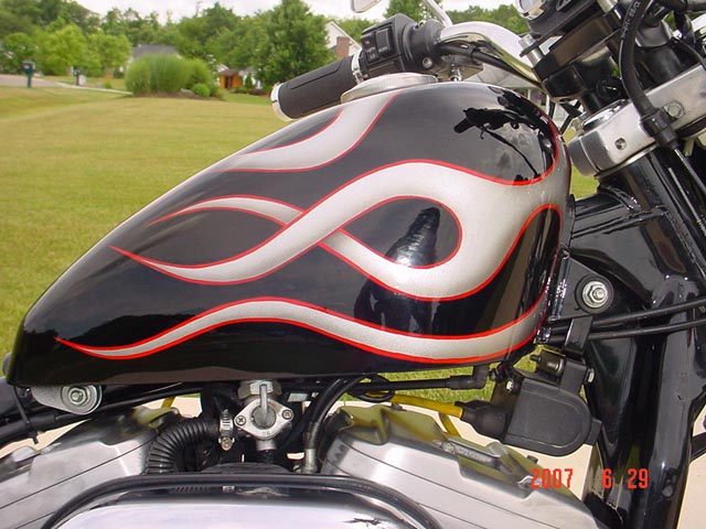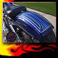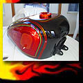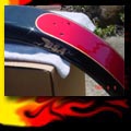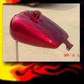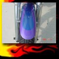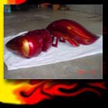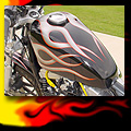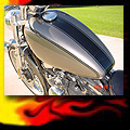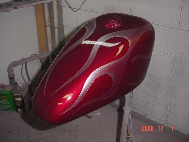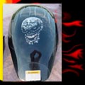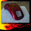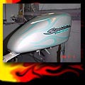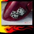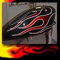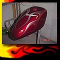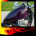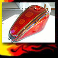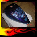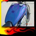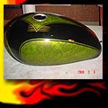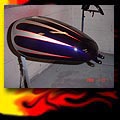 Here are samples of paintwork rendered on gas tanks, fenders, oil tanks, derby covers, air cleaners, helmets, etc. If you can dream it, we can paint it. If you have pictures of your ideas, we can work from them. Everything from mild to wild... sinister-looking solid black to wild kandies. All completed to a high-gloss mirror-like finish using highest-quality House of Kolor paints and clearcoats.